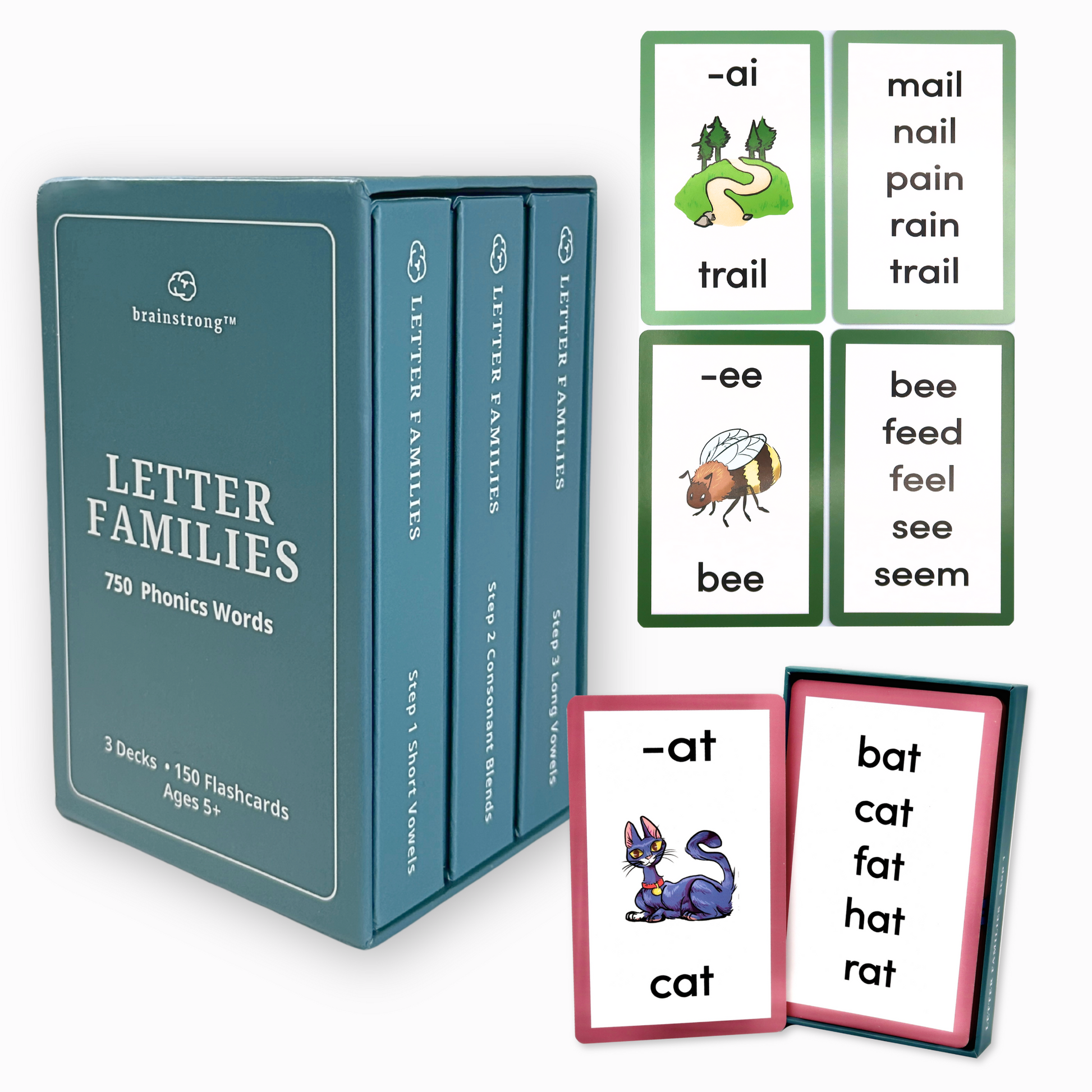 Step 3: Long & Irregular Vowels – 50 letter families with long and irregular vowel sounds, helping kids master advanced reading patterns.